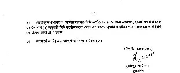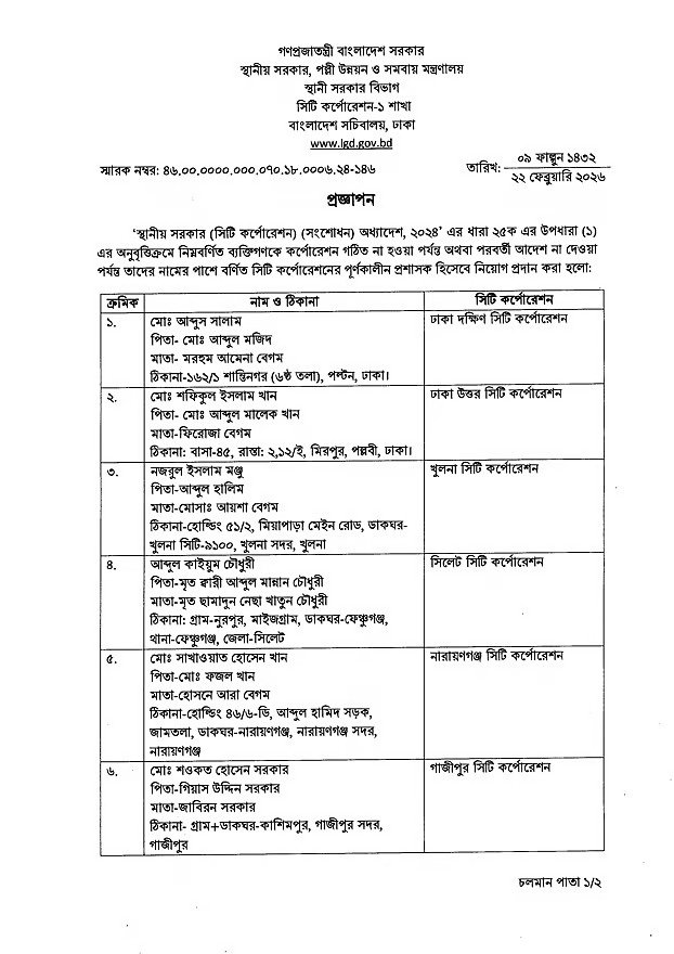 ঢাকা উত্তর–দক্ষিণসহ দেশের ছয় সিটি করপোরেশনে ছয়জন প্রশাসক নিয়োগ দেওয়া...