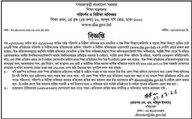 গতকাল রোববার (১ মার্চ ২০২৬) অধিদপ্তরের ওয়েবসাইটে প্রকাশিত বিজ্ঞপ্তিতে জানানো হয়, ২০২৫ সালের ১ জুলাই থেকে ৩১ ডিসেম্বর পর্যন্ত মাধ্যমিক ও উচ্চশিক্ষা বিভাগ এবং কারিগরি ও মাদ্রাসা শিক্ষা বিভাগে মোট ৯৭৩টি শিক্ষাপ্রতিষ্ঠানের পরিদর্শন ও নিরীক্ষা বা তদন্ত প্রতিবেদন পাঠানো হয়েছে। এসব প্রতিবেদনের তালিকা ডিআইএ’র ওয়েবসাইটের নোটিশ বোর্ডে প্রকাশ করা হয়েছে।